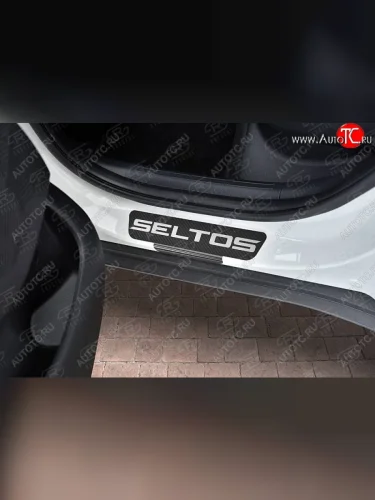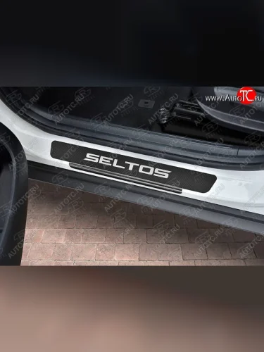 Пороги накладки Russtal KIA Seltos SP2 дорестайлинг (2019-2022) (Нержавейка с покрытием карбон и надписью) в Самаре Самарской области