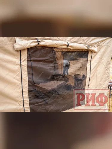 На внутренней стенке есть огромный проем на молнии, позволяющий открыть боковую дверь автомобиля прямо из-под маркизы, не выходя под открытое небо.