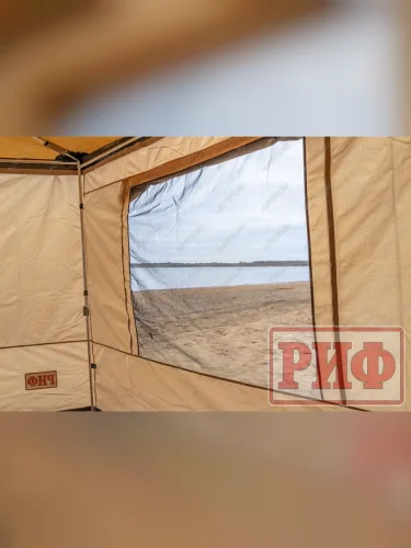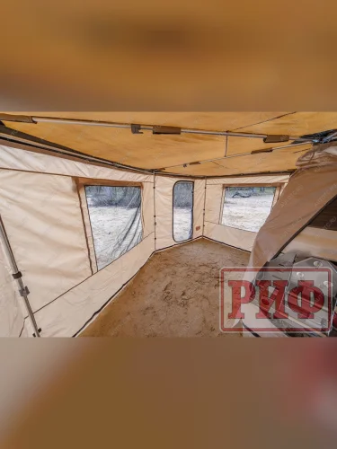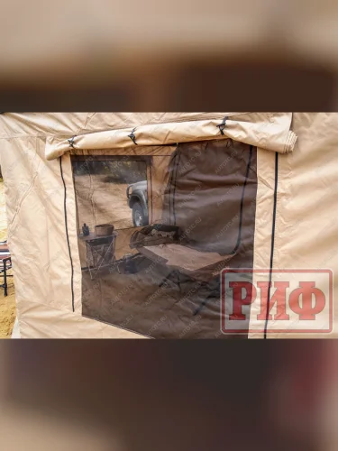 На внутренней стенке есть огромный проем на молнии, позволяющий открыть боковую дверь автомобиля прямо из-под маркизы, не выходя под открытое небо.