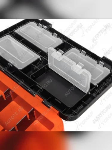 На внутренней стороне откидной крышки размещены 4 прозрачных закрывающихся бокса, в которых достаточно места для блесен, балансиров, рыболовных крючков, мормышек и прочих мелких снастей. Вставка-органайзер имеет две секции, где можно удобно разместить удильники, а при необходимости эти секции можно разделить на более мелкие отделы с помощью съемных перегородок, входящих в комплект. Также имеются 6 прорезей для фиксации коротких удочек.