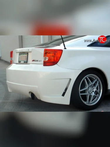 Общий вид изменённого заднего бампера достаточно богат на различные дизайнерские решения. Во первых, он значительно ниже стандартного бампера, что достаточно хорошо сказывается на аэродинамических характеристиках машины, а также он визуально закруглён и загибается к нижней части, что несомненно улучшает его визуальные показатели. В центральной части бампера расположена обширная глубокая ниша - данный элемент придаёт дизайну бампера более стильную и мускулистую форму. Основное отличие изменённого бампера от стандартного Toyota Celica (1999-2006) T230 – теперь в боковых частях бампера расположены дефлекторы, предназначенные для обеспечения вывода воздушного потока с колёсной ниши автомобиля, при организации такового. Это решение позволяет более эффективно охлаждать задние барабанные тормоза. Данный стильный дизайнерский ход позволил сделать заднюю часть Toyota Celica (1999-2006) T230 более зрелищной и внушительной по сравнению со стандартной версией.