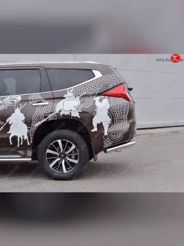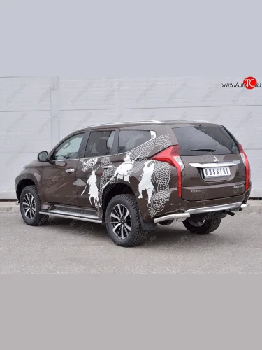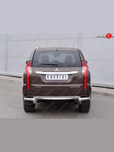 Защита заднего бампера (Ø63 мм уголки под фаркоп, нержавейка) SLITKOFF Mitsubishi Pajero Sport QE дорестайлинг (2015-2021) (полированная нержавейка) в Самаре Самарской области
