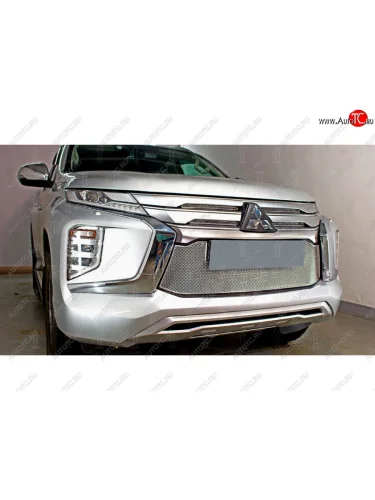 Защитная сетка в бампер (низ, ячейка 4х10 мм) Стрелка11 Премиум Mitsubishi Pajero Sport QF рестайлинг (2019-2022) (Хром) в Самаре Самарской области